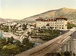 In Mostar, at the end of the 19th century, a city zone was defined on the tops of the triangular valley, which is cut along by the Neretva river. The increased traffic needs required a better connection across the Neretva, so in addition to the existing Stari Most bridge, which is being adapted for road traffic, three more bridges were built. The central city axis that connected the railway station - the new business center in the west - with the Francis Joseph Bridge (1888) with the mosque on the left bank, was transformed into a new social center. A school, a hotel "Neretva" and a city bath, colloquially named the Banja, are being built on that area, buildings that replace old inns and hammams. Parallel to the construction of this space, the architects of that time introduced eclectic decorative elements collected during study trips of Austrian architects in Egypt and Spain, with the aim of not completely negating the Islamic architectural spirit of the city environment.[7][8][5]