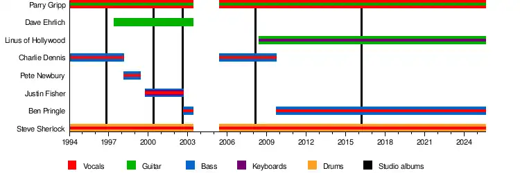 ![]() Nerf Herder in 2016 (L–R) Ben Pringle (bass); Linus of Hollywood (guitar, keyboard); Parry Gripp (vocals, guitar); Steve Sherlock (drums) | |