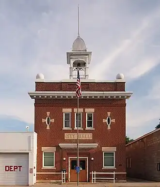 Designed by the St. Paul firm of Thori, Alban, & Fisher, it was constructed in 1908. It features a symmetrical facade and is capped by a wood cornice with modillion blocks and a central bell tower. The central bay features a double doorway framed by brick pilaster strips and dentillated wood cornice. The main door is flanked by large two part windows with stone sills and headers. A large stone bearing the words "CITY HALL" separates the door from three rectilinear windows in the second story bay; these are flanked by small oval windows. The open bell tower shelters a bell and features a dentillated cornice and domed roof capped by a flagpole. Spherical finials flank the bell tower at the corners of the building.[3]