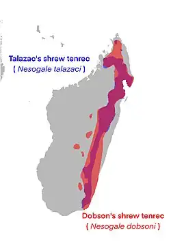 These species are distinguished from the other shrew tenrecs of Microgale by being more robust and larger, and by their lack of premolar diastemata.[1] They are distributed over much of the eastern and northern areas of the island. Nesogale and Microgale are estimated to have split during the Early Miocene, about 19 million years ago.[1]