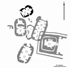 Structure 8 is roughly contemporary with structure 1, probably having been built just after structure 1 was completed.[26] It comprised 10 piers and ten recesses, and had six hearths. The remains of at least two earlier buildings lie beneath it and structure 8 appears to have undergone severe subsidence itself. Its floor slumped in antiquity, causing the roof to fall in, and some of its stones were used to form structure 10.[26]