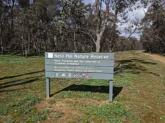 ![]() Entrance sign, Nest Hill Nature Reserve | |