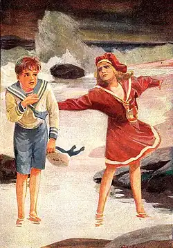 Life on the island, the landscape and manners, dress and speech, are described in detail. The North Germans in the story speak Plattdeutsch (Low German), which Ury transliterates, with a German translation of some words in parentheses. Anne Marie makes friends with the naughty boy Peter. The two walk together to seek wealth and swords in the mud, stray off the path, and get into a storm surge. But they find (albeit with difficulty) their way out of the dangerous situation.