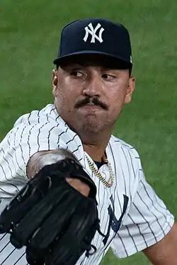 On December 20, 2020, Cortes signed a minor league contract to return to the New York Yankees organization.[27] Cortes began the 2021 season with the Triple-A RailRiders, then was promoted to the majors on May 30.[28] Over the course of the 2021 season, Cortes became a favorite of Yankees fans. His signature mustache, along with his unique style of pitching and many productive appearances, garnered him much praise, and brought the moniker "Nasty Nestor."[29] He finished the year with 93 innings pitched over 22 appearances, 14 of them starts, and finished with a 2.90 ERA and 103 strikeouts.[23]