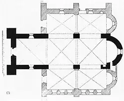 The church walls are made of ashlar[9] and the church has three naves and three apses. All three naves have entrances to their west.[2] Originally, the church was built with a single nave and a protruding apse; the other two naves and two minor apses were added at a later date. During this transformation, the eastern and central bays were demolished to be replaced by arcades supported by square pillars. The western bay, according to Bacci, was turned into "a kind of narthex or vestibule". The older façade of the building is plainer, with a round window and a plain portal, while the portal of the southern nave, added later, is adorned with an oeil-de-boeuf and marble mouldings.[5]