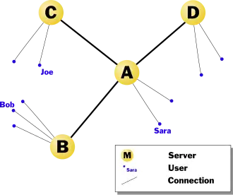 When the connection between A and C is severed, users who were connected to other servers that are no longer reachable on the network appear to quit. For example, if user Sara is connected to server A, user Bob is connected to server B, and user Joe is connected to C, and C splits, or disconnects, from A, it will appear to Joe as if Sara and Bob both quit (disconnected from the network), and it will appear to both Sara and Bob that Joe quit. However, Joe can still talk to anyone who is connected to the same server (in this case server C). This happens because the servers to which they are connected are informed of the change in the network status, and update their local information accordingly to display the change.