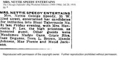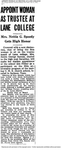 Nettie and her husband Walter Speedy were active participants in Chicago’s social and athletic communities. She was the first woman to become a trustee at Lane College in Tennessee,[18] reflecting her influence and commitment to advancing educational opportunities.