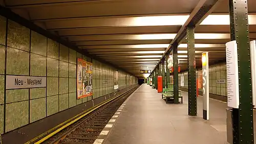 Neu-Westend is a Berlin U-Bahn station on line U2. It opened in 1922 and was built by A. Grenander. In 1986 the station was renovated, but the original eastern entrance was kept.[2]
