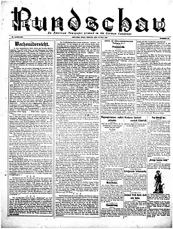 The Neu England Rundschau (New England Review) was a weekly German language newspaper published by The German-American Publishing Company, Wisly Lithograph Company, and subsequently the Wisly-Brooks Company, Inc. of Holyoke, Massachusetts from 1883 until 1942, the longest running German newspaper in Massachusetts.[3] A second edition of the paper was also sold in Connecticut under the masthead Connecticut Staats-Zeitung (Connecticut State Newspaper).[4] Following scrutiny by the US Department of Justice and Office of Strategic Services of the broader German American press, as well as declining circulation, the paper ceased publication in 1942 during the Second World War.[5][4]