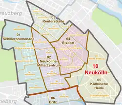 Neukölln has nine primary neighborhoods (Kieze), administratively called Ortslagen,[2] among them the historical sites of Neukölln's foundation south-east of the quarters's geographical center,