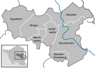 Neunkirchen (German: [ˈnɔʏnˌkɪʁçn̩] ⓘ) is a Kreis (district) in the middle of the Saarland, Germany. Neighboring districts are Sankt Wendel, Kusel, Saarpfalz, Saarbrücken, and Saarlouis.