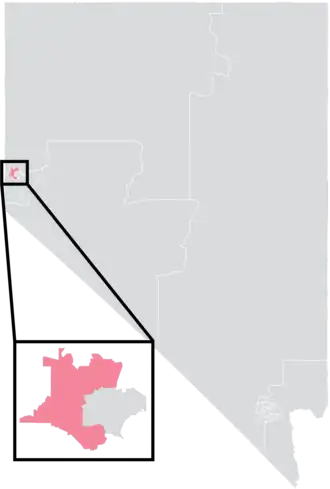 The district is located entirely within Nevada's 2nd congressional district, and overlaps with the 25th and 27th districts of the Nevada Assembly.[5] It borders the state of California.[1]