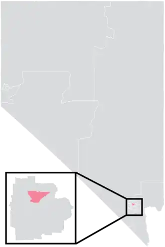 The district overlaps with Nevada's 1st and 4th congressional districts, and with the 6th and 7th districts of the Nevada Assembly.[4] The district has a total surface area of 25 square miles (65 km2) and a perimeter of 26.6 miles (42.8 km).[5]