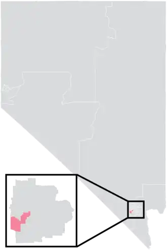 The district is located entirely within Nevada's 3rd congressional district, and overlaps with the 9th and 35th districts of the Nevada Assembly.[4] It has a total surface area of 63 square miles (160 km2), and a perimeter of 43.7 miles (70.3 km).[5]