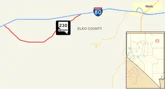 State Route 230 (SR 230) is a state highway central Elko County, Nevada, United States. It is a southern loop route off of Interstate 80 (I‑80) between Elko and Wells, serving the communities of Deeth and Welcome and various ranches within Starr Valley. The road follows a U-shaped path and passes close to the East Humboldt Range. The road was constructed by 1962, but was not designated as a state highway until 1992.