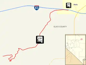 SR 231 begins at the Angel Lake fee booth, providing access to the lake and nearby picnic and campground areas. From there, the highway heads in a general eastward direction, descending through switchbacks along the east side of the East Humboldt Range. Once traveling about 5.5 miles (8.9 km) to clear of the mountains, the road turns more sharply to the north. The final 1.5 miles (2.4 km) sees the route turn more directly eastward to enter the town of Wells. SR 231 comes to its northern terminus at the intersection of Angel Lake Road and Humboldt Avenue (SR 223) in Wells, just south of Interstate 80.[1][2] Angel Lake Road may be closed to travel during winters.