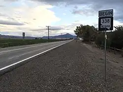 As SR 338 heads down from the summit, it passes between the Wellington Hills to the west and the Pine Grove Hills to the east. The route crosses several small creeks as it heads north entering the Smith Valley.[3] Farmlands come into view as the highway approaches its junction with Wellington Road (SR 829), which heads towards Wellington and points west. State Route 338 continues due north from here, heading through more farm tracts before ending at a "Y" junction with State Route 208 just south of Smith.[2][4]