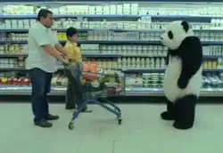 Two similar commercials also appear. In the first commercial, a father and son are at the grocery store. The son suggests they buy Panda cheese, but the father says their shopping cart is full. The panda appears and stares at the father before tipping over the shopping cart and stomping on the spilled merchandise. In the second commercial, the father and son return to the store, and the father is intimidated by the panda enough to buy two packages of Panda cheese before everyone walks away peacefully.[1]