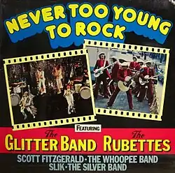Never Too Young To Rock is a 1975 British musical comedy film directed by Dennis Abey and starring Peter Denyer and Freddie Jones. It features musical artists popular at the time of release including The Glitter Band, The Rubettes, Mud, Scott Fitzgerald, Slik and Bob Kerr's Whoopee Band.[1]