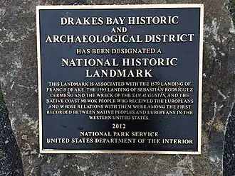 In October 2021, the California State Parks Director Armando Quintero designated Site of New Albion as California Historical Landmark number 1061.[85] The 215 acre location, identified as Drake's Cove, is all within the boundaries of Point Reyes National Seashore.[85][87] The state's Office of Historic Preservation states, "New Albion is the landing site and encampment of Sir Francis Drake's expedition to California in 1579, located in the coast of Marin County," and specifies several notable events associated with the landmark: "Includes sites of Drake's fort, the careening of the Golden Hind, the abandonment of Tello's bark, and the meetings with the Coast Miwok peoples".[87][88]