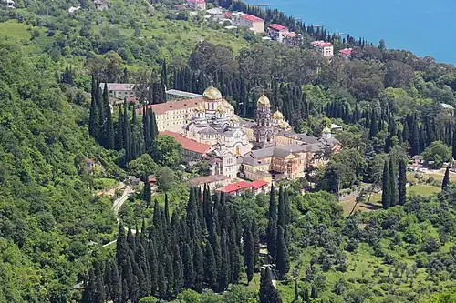 New Athos Monastery (Georgian: ახალი ათონის მონასტერი, romanized: akhali atonis monast'eri; Abkhaz: Афон Ҿыцтәи аберҭыԥ; Russian: Новоафонский монастырь, Novoafonskiy monastir’) is a monastery in New Athos, municipality of Gudauta, in a breakaway republic of Abkhazia (mostly internationally recognized as a part of Georgia). New Athos Monastery was founded in 1875 by monks who came from the St. Panteleimon Monastery in Mount Athos, with Mount Athos having been an important site for the Orthodox Church since 1054. [2]