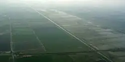 Towards the northern end of the washes, the New Bedford River is joined by the River Delph at Welmore Lake Sluice. The origins of this channel, which is sometimes called the thirty-foot drain, are obscure, although it was built to assist the removal of water from the washlands, according to C. N. Cole writing in 1784. Prior to 1825, there was a dam where the sluice is located, and water was let out of the washland by cutting a slot in it, which the flood water enlarged as it passed through. The cost of rebuilding the dam at the end of the process was considerable, and this unsatisfactory arrangement was replaced by a sluice. At the same time, the New Bedford River was made wider and deeper, while some of the flood banks were also raised.[4] At its southern end, the River Delph is connected to the Old Bedford River at a double bend near Welches Dam. The northern half of the Old Bedford River is no longer connected to its southern half. It is not known exactly when this configuration was built, although it may have been between 1789 and 1821, since Cole's map of 1789 shows the Old Bedford River proceeding in a straight line, and Baker's map of 1821 shows two rivers, each with a double bend.[5] Blair argues for a date soon after the New Bedford River was built, however, since Welches Dam is named after Edmund Welche, who worked with Vermuyden, and the dam in question was originally built across the Old Bedford River.[6]