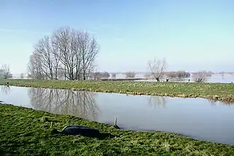 The area between the two Bedford Rivers, 20 miles (32 km) long and 1,070 yards (980 m) wide at their greatest separation near Welney,[11] is below the rivers and below sea level, and is frequently flooded during winter. There is a sluice at Earith which is used to control the waters of the River Great Ouse. It was built with nine openings in 1637, but was subsequently rebuilt with seven openings in 1824, and again with three openings in 1954. When flows in the upper river are normal, the sluice gates are closed, and most of the flow is routed along the tidal New Bedford River. As flows increase, the sluices are opened, and water flows along the Old Bedford River, which progressively floods the 8.9 square miles (23 km2) of washlands which comprise the Ouse Washes.[12] At Welney, these washes provide an ideal habitat for wildfowl and other birds, and the Wildfowl and Wetlands Trust has established a nature reserve here, the WWT Welney. The reserve occupies 990 acres (400 ha), and is accessible from the A1101 bridge by following a minor road to the carpark, and then crossing the New Bedford River by a footbridge. It is important for its wild flowers, dragonflies and butterflies, as well as the birds, which are most numerous when the washland is flooded.[13]
