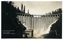 The dam is the fourth constructed on the Bullards Bar site, succeeding diversion dams built in 1899 and 1900 as well as a 200-foot (61 m) concrete arch dam built by the Yuba River Power Company and transferred to Pacific Gas and Electric Company in 1922. The dam generated power from 1924 until its inundation by the New Bullards Bar Reservoir in 1969. Although the 1899 diversion dam was washed away, the 1900 dam is still in place underwater about a quarter mile (0.4 km) upstream from the present dam.[5]