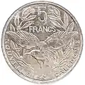 The overall design of the New Caledonia coins did not change from their introduction until their withdrawal in 2023. The obverse was identical to that of the French Polynesian coins. The only changes were the removal of the text Union Française after 1952 on the reverse, and the addition of the issuer initials "I.E.O.M" (Institut d'émission d'outre-mer) to the obverse in 1972.[2]