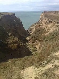 New Chine is a geological feature on the south west coast of the Isle of Wight, England (the Back of the Wight). It is west of the village of Chale. It is a sandy coastal ravine, one of a number of such chines on the island created by stream erosion of soft Cretaceous rocks. It leads from the 190 foot high clifftop to a knickpoint approximately one third of way down the cliff face above Chale Bay beach.