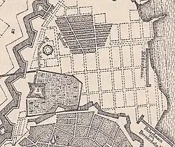 As part of his aspirations to strengthen Copenhagen as a regional centre, Christian IV decided to expand the area of the fortified city northwards. As early as 1606, when his modernization of the fortifications began, he had purchased 200 hectares of land outside the Eastern City Gate. His intention was to redevelop this area into a new district referred to as Ny København (English: New Copenhagen) or Sankt Annæ By (Saint Ann's Town).[1] The plan was to change the course of Østervold, which at that time made a bend and ran along what is today Gothersgade and Kongens Nytorv. The new Østervold would be a direct extension of Nørrevold, connecting it to Sankt Annæ Skanse, thereby increasing the area of the fortified city with approximately 40%. However, the 1630s was a time of economic crisis and both Sankt Annæ Skanse and the new course of Østervold was delayed with no major work going on during that decade. After both Jutland and Scania had been occupied by enemy forces in the first half of the 1640s and the Kingdom's very existence had been threatened, work on the fortifications was resumed.