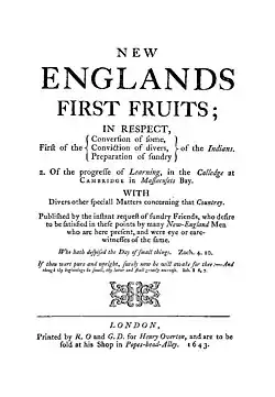 New England's First Fruits was a book published in London in 1643 about the early evangelization efforts by the Puritans in colonial New England in defense of criticisms from England that little evangelism was being pursued in New England.[1][2] It was the first publication to mention Harvard College.[3]
