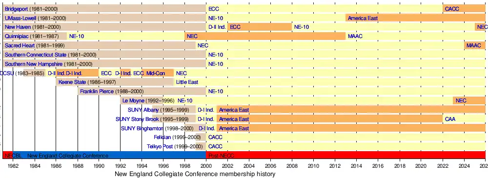 - 1995 – The State University of New York at Albany and the State University of New York at Stony Brook joined the NECC in the 1995–96 academic year.
