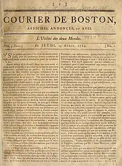 The French language remained extant in Boston during its time as a British colony, though not abundant, one reason being a fear of the influence of Catholicism; academically this prevented the language from gaining early acceptance at Harvard, when its first instructor was dismissed in 1735, after two years of teaching, due to rumors of converting students from Protestantism.[12] Six decades later, one of the first publishers of a French textbook in the Americas was Harvard's first salaried French instructor, Joseph Nancrède, who compiled then-contemporary French texts and published them alongside limited English translations in his L'Abeille Françoise in 1792. Years before, in 1789, Nancrède established the first French newspaper of Boston, a short-lived weekly published for six months that year which he described in its prospectus as a means to foster commerce between the Americans and French-speaking world, and "to convey adequate ideas of the Majesty of Congress to nations who scarcely know that there is one existing."[12][13]