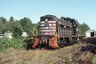 In 1985 the railroad purchased its first two non-leased locomotives, an EMD GP18, #503, and an EMD GP7, #302, from the bankrupt Chicago, Rock Island and Pacific Railroad. The locomotives were painted in a green and yellow scheme and went to work immediately.[1] 302 was originally slated to work on the B&M trackage near Worcester with access to Gardner, but that deal fell through when the Providence & Worcester Railroad objected.[1] Access to trackage between Manchester and Boscawen had bolstered the railroad's yearly carloads from 250 to nearly 2,750, much of which was due to Blue Seal Feeds at Bow Junction, and International Salt in Bow.[1] In the late 1980s the railroad was also operating a Reload on former B&M branch in Chicopee Falls, Massachusetts for Georgia Pacific, and provided rail-plant maintenance and on-site switching at the SD Warren Paper Mill in Skowhegan, Maine. NEGS also performed various maintenance-of-way contracts around New England, in MA, ME, NH and VT.[1] Less fortunate, was a proposed significant aggregate move from Columbia Falls-Centerville, Maine area, west to deep water near Bucksport, over the former Maine Central's Calais Branch of Maine DOT, which fell through. A 1988 bid on the ex-Grand Trunk line in Maine, New Hampshire and Vermont, went instead to the St. Lawrence & Atlantic Railroad.