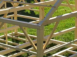 Development of the New England barn began early in the 19th century, but they usually date from after 1830. They were the most popular barn type in New England by 1860.[12] The construction is very different from the English barn typically being built using the square rule method of joinery, raised in bents, increasingly of sawn rather than hewn timbers, common rafter roof framing with purlin plates, designed to be used with a hay track, straight posts rather than flared (gunstock) posts, and dropped tie beam framing rather than the English tying joint. The doors are mounted on the gable end rather than the sidewall and after the 1840s mounted on rollers so they slide sideways rather than being mounted on hinges and swinging outward. Sometimes they have interior sliding doors. Doors on rollers are believed to have been a development from rail cars which had sliding doors.[3] A full basement became standard and was used primarily for manure management with trap doors in the floor of the tie-up so manure was easily shoveled into the basement for later use on the fields. This is a significant difference between the Pennsylvania Barn where the cows were housed on the basement level. The basements also had sliding doors, sometimes arranged as a drive through passage. The foundation is dry laid stone, some of which may have been split rather than just being field-stone; and some barns have a top course of large, rectangular, quarried stones. The drive floor was not needed for hand threshing since threshing machines were available by this time. Scarf joints were needed to join timbers longitudinally because these barns are larger in size and the timber supply was more limited so full length timbers were not available. Roof overhangs of a foot are typically built in on the gables and eaves protecting the walls from water. Later in the 19th century these barns may also have ventilators or a cupola on the roof to help reduce moisture build-up inside. Stairways are sometimes found in New England barns but built-in ladders are common but less prevalent than ladders found in the New World Dutch barn. The number and size of cows were larger and were given more headroom so the New England barns were not just longer and wider but taller. Also the New England barn was popular during the period in northern New England when the connected farm building arrangement was popular and so were more likely to be connected to the house through a series of smaller rooms. Some New England barns have an indoor silo. These barns are easier to add on to by adding more bays. The New England barn almost always has a gable roof, but a gambrel roof form may be found on some New England barns. Sometimes the New England barn is framed with studs in the walls and horizontal sheathing boards instead of the more common rails with vertical sheathing.