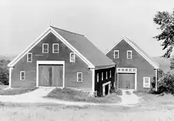 The New England Barn was the most common style of barn built in most of the 19th century in rural New England and variants are found throughout the United States.[1] This style barn superseded the ”three-bay barn” in several important ways. The most obvious difference is the location of the barn doors on the gable-end(s) rather than the sidewall(s). The New England and three bay barns were used similarly as multipurpose farm buildings (housing animals, crop storage and other uses all in one building) but the New England barns are typically larger and have a basement. Culturally the New England Barn represents a shift from subsistence farming to commercial farming[2] thus are larger and show significant changes in American building methods and technologies.[3] Most were used as dairy barns but some housed teams of oxen which are generally called teamster barns. Sometimes these barns are simply called “gable fronted” and “gable fronted bank barns” [4] but these terms are also used for barns other than the New England style barn such as in Maryland and Virginia[5] which is not exactly the same style as found in New England. A similar style found in parts of the American mid-west and south is called a transverse frame barn[6] or transverse crib barn.[7][8][9][10][11]