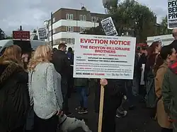 The New Era Tenants' Association of estate residents had been involved in protests over the increase in rents proposed by its new landlord, the U.S.-based investment fund Westbrook Partners.[2] After Russell Brand joined the protests in 2014, footage of his clash with a television reporter at a 10 Downing Street demonstration in Westminster went viral on YouTube, bringing the issue to greater public notice.[3][4][5] A petition raised 350,000 signatures in support of the residents,[6] and Hackney Council became involved in negotiations with Westbrook Partners.[7]