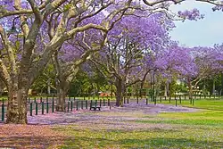New Farm Park's 15.0076 hectares (37.085 acres) currently contains a wide variety of trees, both mature and recent plantings, including jacarandas, poincianas, figs, palms, and coral trees. The central lawn within the jacaranda drive contains the remnants of the post-1948 rose garden arrangements, and an area of rainforest has been planted behind the library. In the shade of the trees near the kiosk site is an understorey of tropical plants, a character of park planting that is a distinct aspect of Brisbane's historic parks and large gardens.[1]