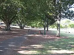 Features that have been lost over time include the bougainvillaea planted around the rose gardens (gone between 1940–1946); the two lagoons, and the east–west pedestrian path through the centre of the park (gone by 1937); the tennis courts and basketball courts lost when the library was built in 1975; two old dressing sheds near the oval; sightboards at the north-east and south-west sides of the oval; an iron gateway on the south-eastern side of the oval; two old toilets between the Dixon Street entrance and the croquet lawns, and the 1954 rose pergola. An arbour that replaced the latter has also been removed since 2001. The 5.9" memorial gun, the Albatross aircraft and its shelter, and a caretaker's cottage that once stood on the north-east boundary, north-west of the gardeners' depot, have also departed. In addition, the Oakman-era oval pathway inside the jacaranda drive, marked by the surviving mature poincianas, and most of Oakman's 1948–1953 rose gardens design, which was laid out within the circuit of the jacaranda drive, has disappeared. There was also a shelter just inside the loop road, on its northern side. The part of the surviving rose gardens that most closely resembles Oakman's original design is the large spiral near the bandstand. The original vehicle entrance is currently blocked to cars. In 2000, a four-month trial by the Brisbane City Council of an Aboriginal homeless shelter near the playground was ended by the Queensland Government. Dog toilets have also come and gone recently.[1]