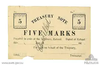In 1914, during World War I, German New Guinea was quickly occupied by Australia. That year, the Australian authorities issued Treasury notes denominated in marks. In 1915, the Mark was replaced by the Australian pound.