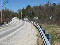 After splitting from US 3, NH 11 intersects with NH 11C and NH 11B as it heads towards Lake Winnipesaukee. The highway turns southeast along the southern end of the lake and crosses into the town of Alton. NH 11 intersects the eastern terminus of NH 11A before continuing south along the west side of Alton Bay. This section of the highway has views of the bay and of Lake Winnipesaukee as a whole. Route 11D (formerly NH 11D) provides local residential access along this semi-limited access section. NH 11 descends into Alton village and intersects with NH 28A, which runs up the eastern side of the bay. NH 11 and NH 28A overlap through the downtown area (although NH 28A is only signed in the northbound/westbound direction), passing the eastern terminus of NH 140 before meeting NH 28 at a large roundabout, where NH 28A ends. NH 11 continues southeast through New Durham without any major intersections before continuing into Farmington. NH 11 bypasses downtown Farmington to the southwest, with NH 75 and NH 153 providing local access. The highway continues southeast and crosses into the city of Rochester. NH 11 as a standalone route ends at its interchange with the Spaulding Turnpike (NH 16) and US 202, where it leaves its surface alignment and joins the Turnpike at exit 15. NH 11 exits the Turnpike at exit 16 with US 202 after less than 1⁄4 mile (0.40 km) and interchanges with NH 125, which provides local access to downtown Rochester. US 202 and NH 11 continue through the district of East Rochester before crossing the Salmon Falls River into Lebanon, Maine. US 202 continues across the border while NH 11 becomes Maine State Route 11 and changes cardinal directions to north-south.