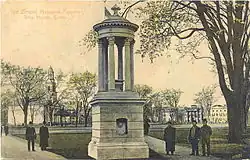 In its early years, the Green held a watch house, a prison and a school.[3] The upper Green also once held the First Methodist Church. The church was removed from the Green in 1848 with a new church built across Elm Street (designed by Henry Austin). The Green also held a succession of statehouses, dating from the time when New Haven was joint capital of Connecticut with Hartford. The first was built in 1719. As the colony grew, this was replaced by a second, brick colonial building, built in 1763. The most recent state house, on the northwest corner of the green, was erected in 1831, designed by Ithiel Town in a Greek Revival style in stone and marble. Ultimately, Hartford was declared the sole capital and this building was demolished (despite protests by preservationists) in 1889.[7][8]