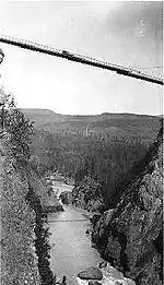 In 1913, to make his townsite more attractive, Robert Kelly decided to have a bridge built across Bulkley River and hired the firm of Craddock and Company to do the work. The bridge was completed that fall, but was very narrow, barely wide enough for a single vehicle. Furthermore, it was 266 feet above the water and had a tendency to sway in the gentlest of breezes. The bridge soon became shunned as even the most courageous and expert drivers felt seasick or damaged their cars while crossing it.[11]