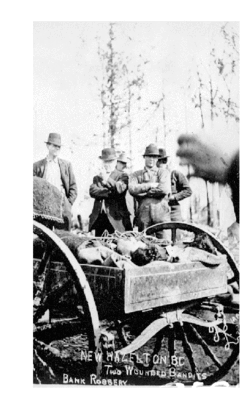 The second robbery occurred on April 7, 1914, already a red letter day for the area as the last spike of the Grand Trunk Pacific Railway was being driven 180 miles away in Fort Fraser. New Hazelton was a busy little town that morning and excitement was high over the completion of the railroad. Many residents and some visiting dignitaries were planning on taking the train to Fort Fraser to watch the ceremonies associated with the driving of the last spike. John Oliver, who would one day become premier and have the town of Oliver named after him, was one of the visitors on that historic day. Little did anyone know that an equally historic event was about to happen right there in New Hazelton, one that would be remembered in hundreds of Canadian history books. Luckily, someone was there with a camera. Those pictures would become among the most famous of that era in British Columbia.
