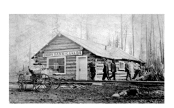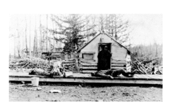 During the Grand Trunk Pacific Railway (GTP) construction land speculation was rife along the proposed route. In July 1911, Lot 883, between the Bulkley River and the northernmost point on the railway right-of-way, was the first property to be marketed as the Larkford townsite. Several Hazelton businesses acquired lots, but it is not clear if they were given or paid for the properties. Lot 882, adjacent to the south, was called Taylorville, because the owner had been either F.C. Taylor or Hugh Taylor.[2][3] Called either the Taylor section[4] or Taylorville, the site was being developed at the time.[5] That month, the surveyed streets were created at Larkford by clearing tree obstructions[6] and the lots were misrepresented as "Larkford, the New Hazelton".[7] Like similar speculative ventures, no evidence exists that buildings were ever erected at Larkford which has since reverted to natural vegetation.