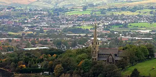 Newhey parish church, dedicated to St. Thomas, was built in 1876 to serve the new Anglican parish of Newhey.[8] Its patron is the Bishop of Manchester.[9] The church was badly damaged by arson on 21 December 2007.[10]