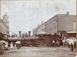 Eastbound Engine 813 had been traveling at a high rate of speed and unbeknownst to its engineer, Charles Ditto, the train's caboose and a few cars had become uncoupled at Kingsfred (located just west of Johnson's Crossing in Union Township, Fayette County). As Engine 813 approached the village of New Holland Mr. Ditto spotted the oncoming westbound Engine 801. Setting off the train's whistle, beginning about 1/2 mile outside of New Holland, Ditto attempted to signal to the brakeman to slow down for a stop, still unaware that the caboose, where the brakeman was located, had become unattached. Realizing what had happened, Ditto quickly put his train into reverse, but it was too late to avoid a collision with the other oncoming train. The engineer of Engine 801, Joe Todhunter, by this time had noticed the approaching Engine 813. In an attempt to save his train and a large amount of freight being carried by the train, uncoupled his engine and three cars, sending them on to meet the approaching train. Eyewitness accounts claimed that the impact of the two trains was so forceful that it could be heard for several miles around. Both engines raised high into the air upon impact and crashed to the ground. Engine 801, a newer engine, suffered heavy damage, with one of its cars being completely demolished. Engine 813 meanwhile was completely destroyed, its tender being overthrown and seven of its cars were demolished, with most of them being thrown across the tracks. The impact had forced one of the cars over another after its wheels were sheared off. Another box car was broken into pieces, with about half of it being thrown and crashing into the back of the Gooley Brother's Implement Store. Fortunately, no injuries occurred as a result of the crash. Both engineers and firemen had jumped to safety just moments before the collision took place. Losses from the crash were estimated at $10,000 [roughly $373,891.67 today[8]], and took workmen from about 10 p.m. that evening until the next morning to clean up the wreckage and debris.[9]