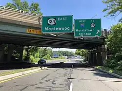 Route 124 is a state highway in the northern part of New Jersey in the United States that is 14.74 mi (23.72 km) long. It is the eastern section of what used to be Route 24 before that road was realigned to its current freeway alignment. The western end is at an intersection with U.S. Route 202 (US 202) and County Route 510 (CR 510) in Morristown, Morris County; the eastern end continues as CR 603 on Springfield Avenue at the border between Maplewood and Irvington in Essex County. The route runs through suburban areas of Morris County, passing through Madison and Chatham. It intersects Route 24 on the border of Millburn, Essex County and Summit, Union County, and serves as a frontage road for that route. Upon splitting from Route 24, Route 124 continues east through Springfield Township, Union Township, and Maplewood to its eastern terminus.