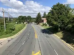Route 31 crosses the Musconetcong River into Washington Township, Warren County, where it heads north into the agricultural Musconetcong Valley. It heads into Washington Borough, where the road becomes four lanes, passing under the Washington Secondary railroad line that is owned by Norfolk Southern and operated by the Dover and Delaware River Railroad and crossing the intersection with Washington Avenue (Route 57). Past the intersection with Washington Avenue (Route 57), Route 31 narrows to three lanes, passing under the Dover and Delaware River Railroad line, and becomes a two-lane road again as it crosses back into Washington Township at the intersection with Essex Road.[1] It heads into farmland before turning northwest and heading across the Oxford Mountain, entering Mansfield Township. While crossing the Oxford Mountain, Route 31 skirts along the border between Mansfield Township and Washington Township. The route enters Oxford Township, where it heads through the community of Oxford as a four-lane road. Route 31 continues north through a mix of woods and agricultural areas past Oxford, crossing into White Township at the intersection with East Quarry Road and coming to its northern terminus at the intersection with US 46.[1][2]
